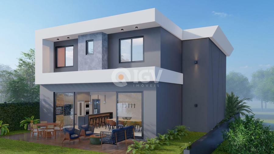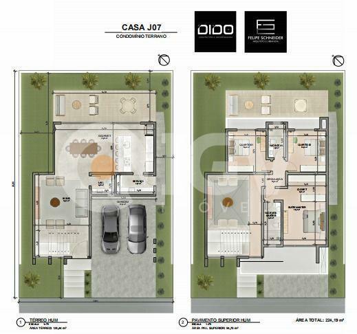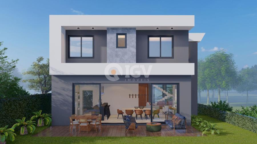 Conta com 3 dormitórios sendo uma suíte no pavimento superior e tem sua área social integrada no pavimento térreo.