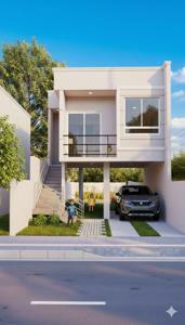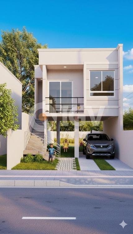 Linda casa sob Pilotis (2 Dormitórios) Terreno 6m x 50m Memorial descritivo de acabamentos Porcelanato Aberturas em Alumínio (Pretas ou Brancas) Portas internas laqueadas Rebaixe em Gesso Nicho no Banheiro Detalhes em LED na fachada Muros frontais de divisas Trilho de acesso veicular Grama em frente a residência Paisagismo em frente a residência Calçada de passeio público em frente ao lote