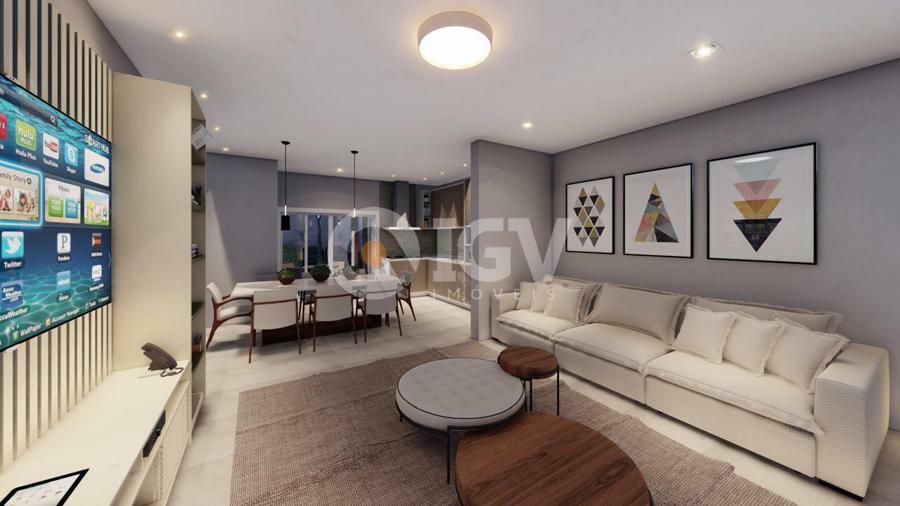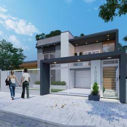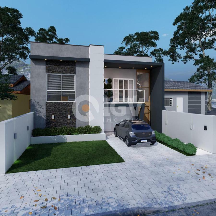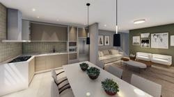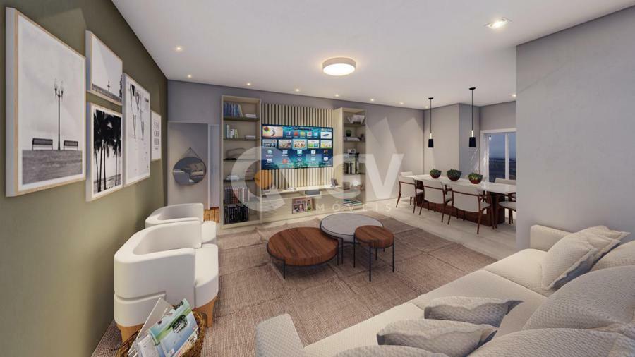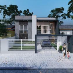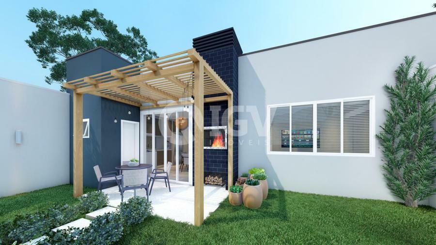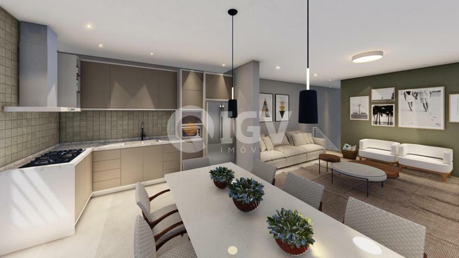 Living integrado com sala de estar, jantar e cozinha, banheiro social, 2 dormitórios, 1 suíte, espaço gourmet com churrasqueira, banheiro externo e piscina.