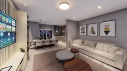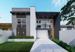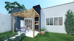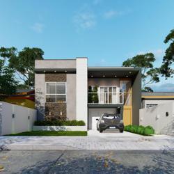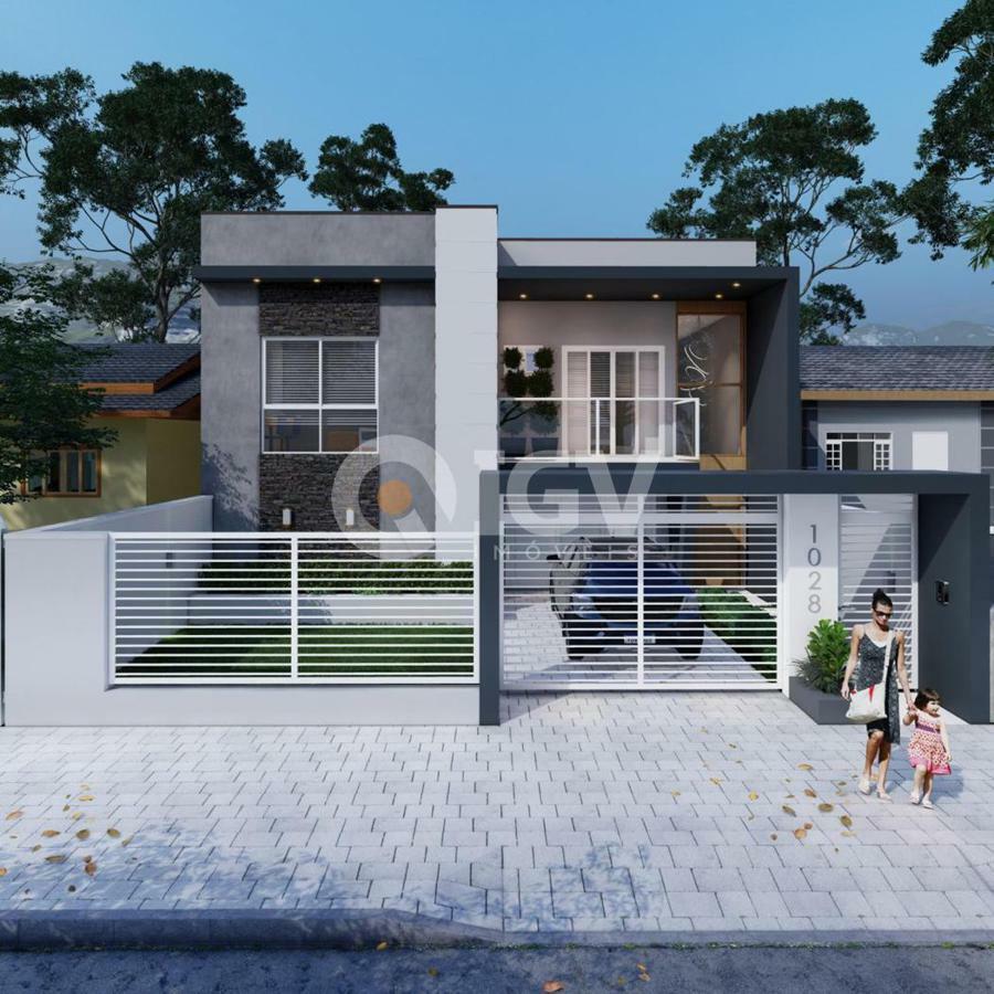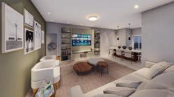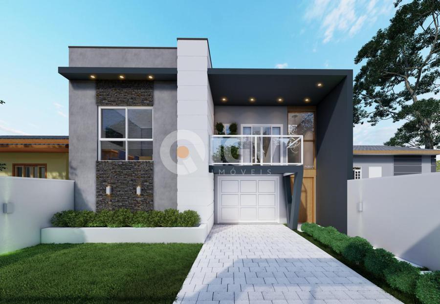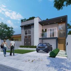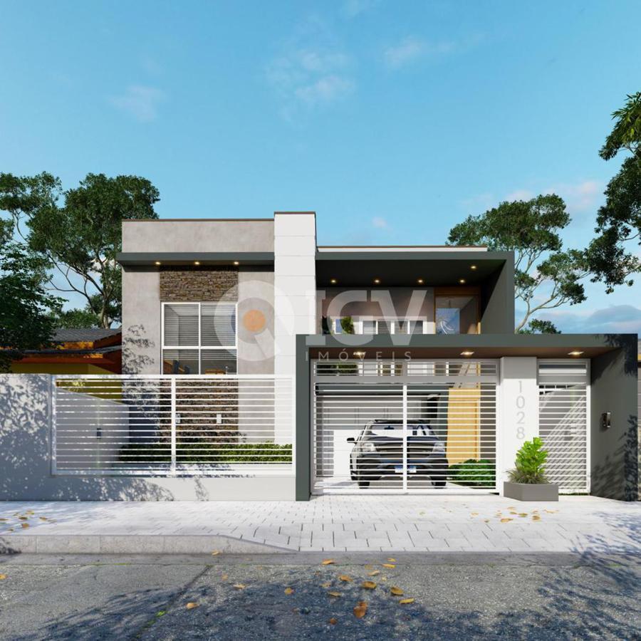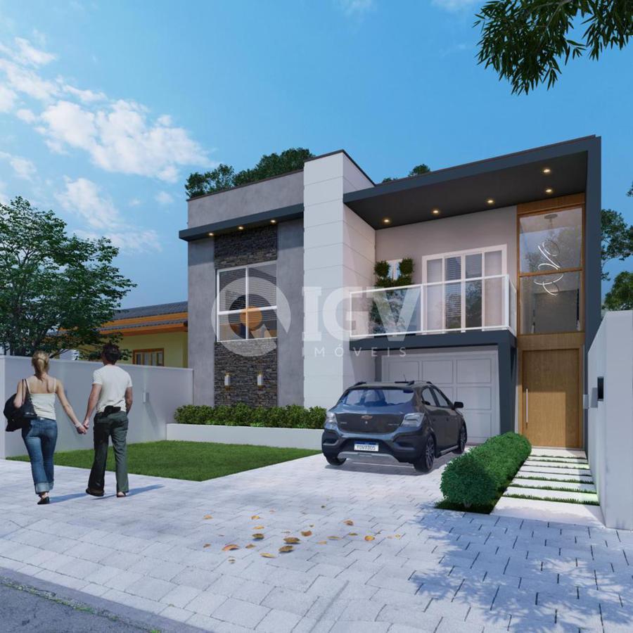 Living integrado com sala de estar, jantar e cozinha, banheiro social, 2 dormitórios, 1 suíte, espaço gourmet com churrasqueira, banheiro externo e piscina.