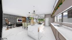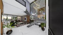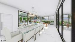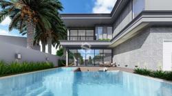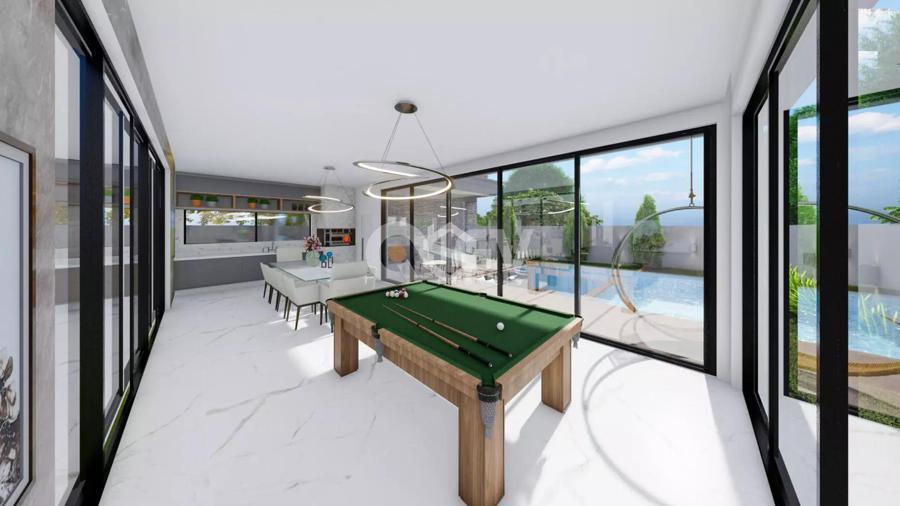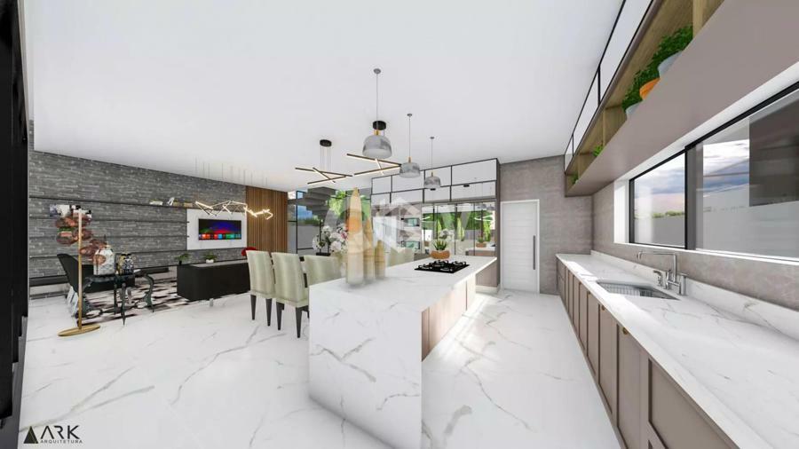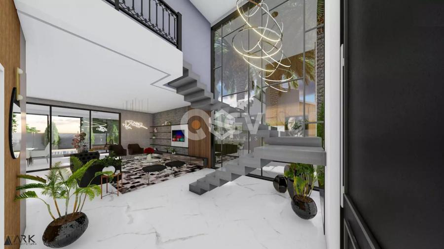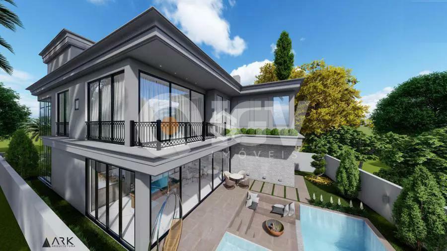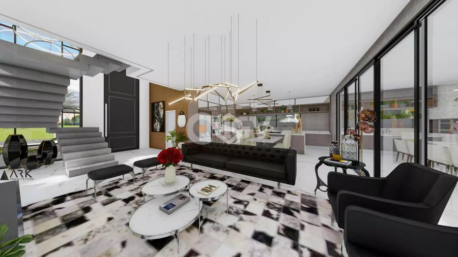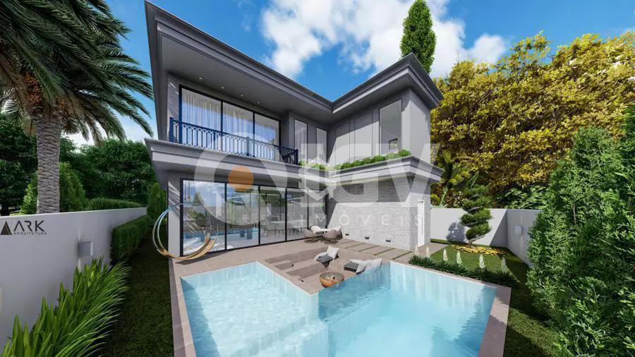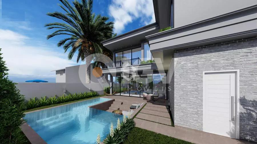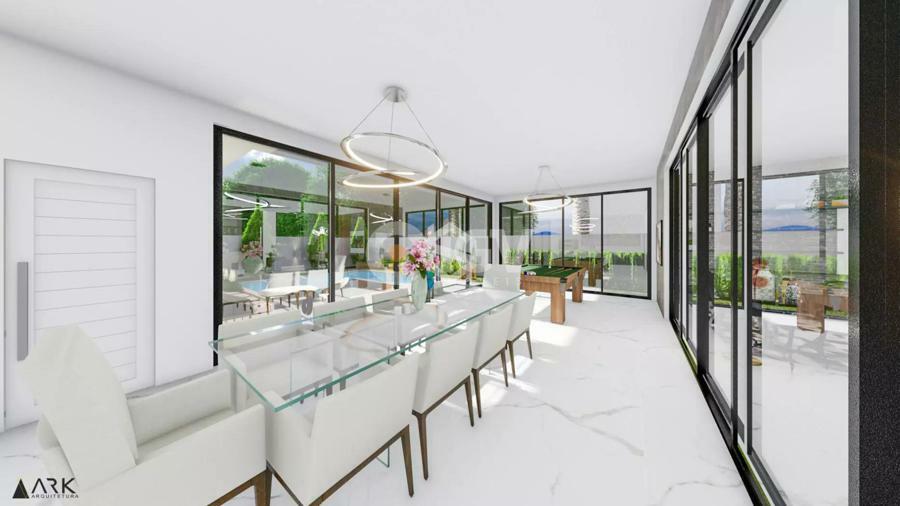 Casa com uma ampla pele de vidro que contempla a fachada e o lado direito da casa. O living integrado em conjunto com o pé direito duplo proporciona uma sensação de conforto e amplitude, com cozinha, sala de estar, amplo espaço gourmet com churrasqueira e jogos, depósito, lavabo, banheiro e lavanderia. Possui 03 suítes sendo 01 master e locker. Em sua área externa, piscina com parede de vidro, deck, fireplace e jardins. Garagem para 2 carros cobertos.